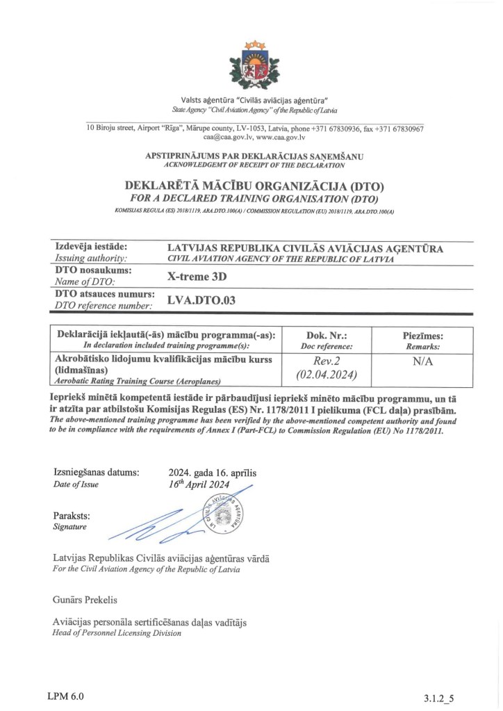 LVA.DTO.03 19 februārī, 202330 augustā, 2024 Deklarētā mācību organizācija ar akrobātisko lidojumu kvalifikācijas mācību kursu (lidmašīnas).